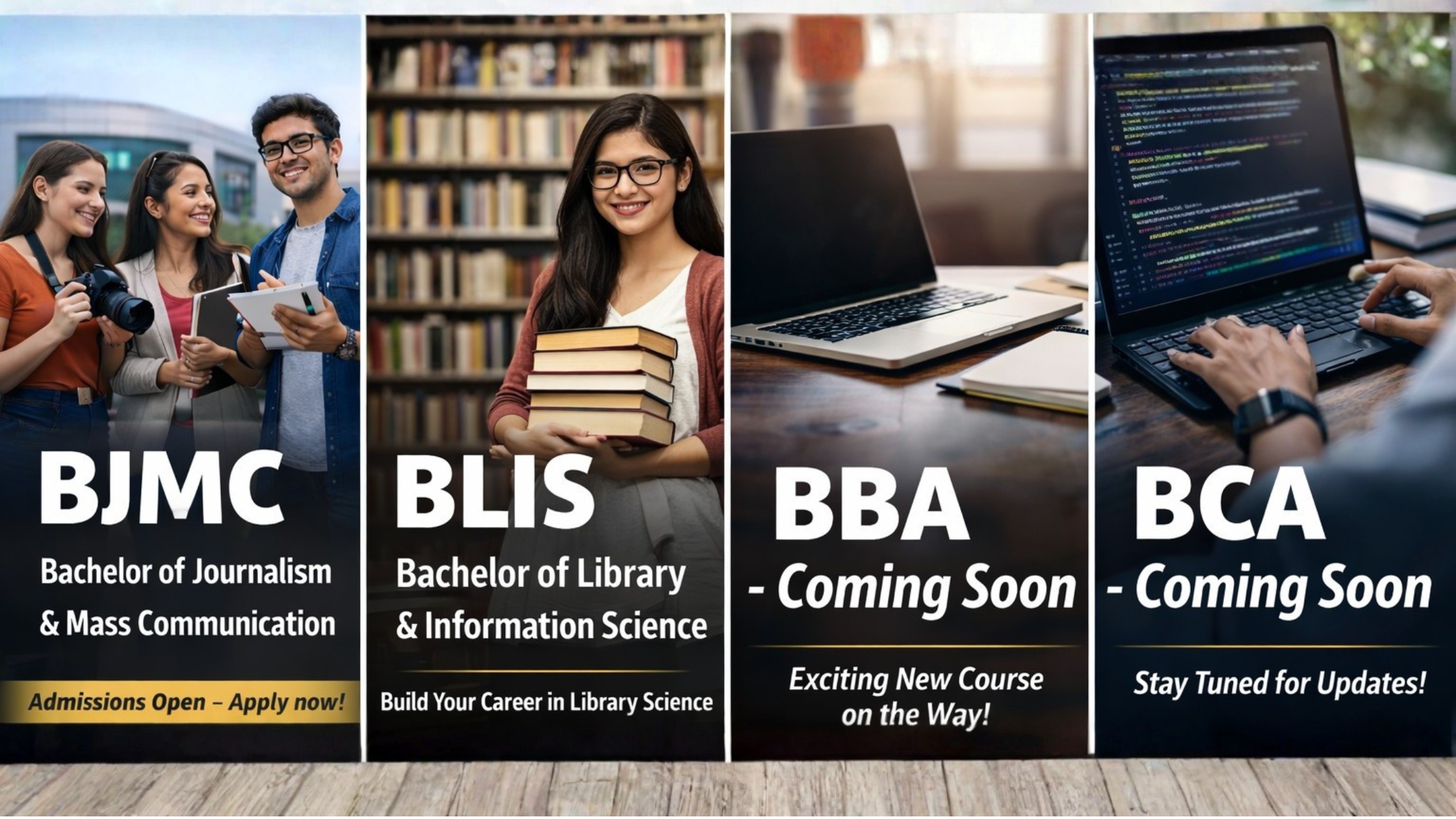We offer a range of industry-oriented undergraduate programs including BJMC, BLIS, BBA, BCA, and other professional courses designed to meet the evolving demands of today’s competitive world. Our experienced faculty, student-focused teaching approach, and supportive learning environment help nurture knowledge, skills, and confidence in every learner.